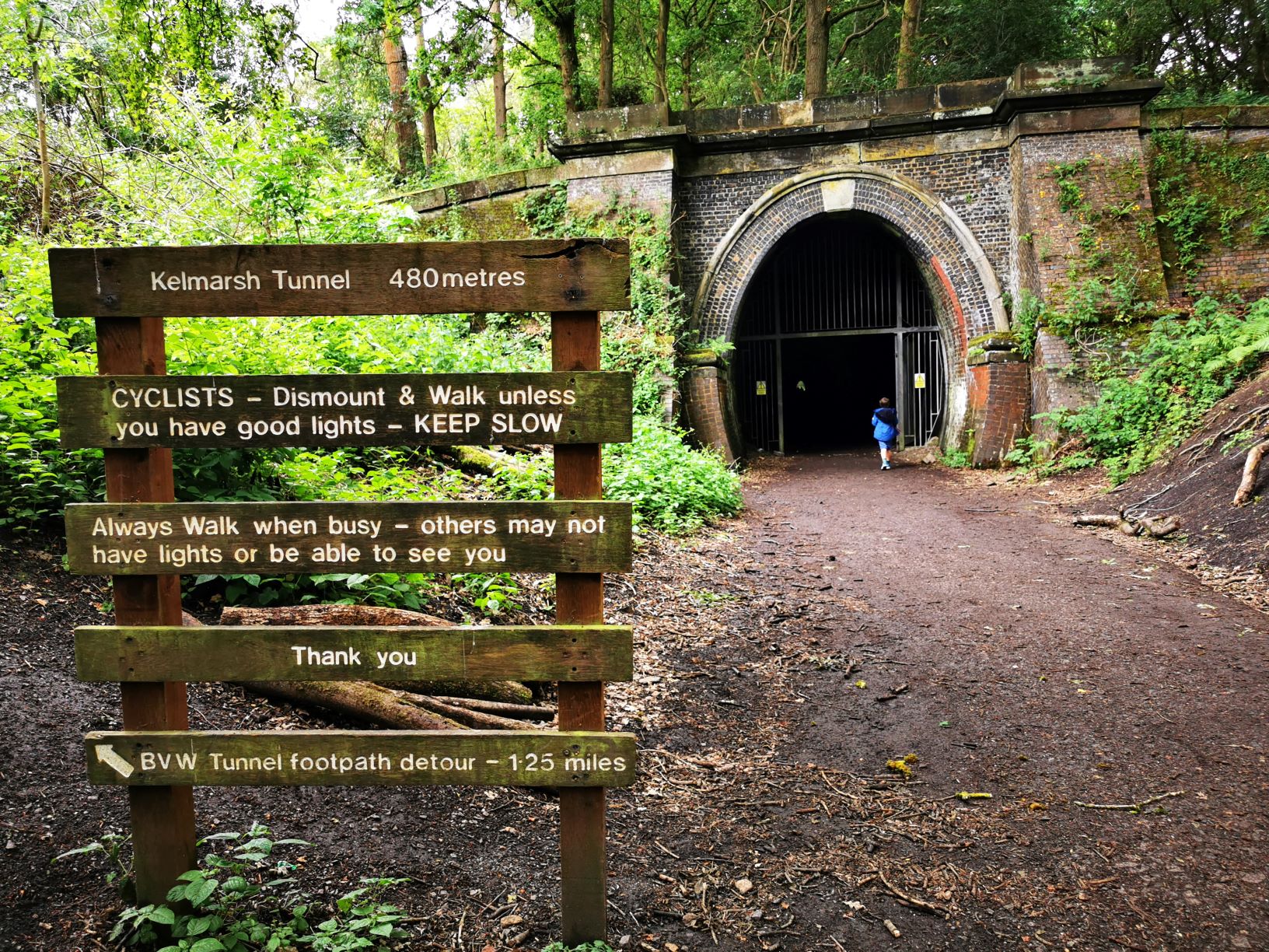 Thankfully as we headed into the wooded area we could start to make out the opening of Kelmarsh tunnels. Quick bit of information the Kelmarsh Tunnels are disused railway tunnels. It is a permitted route and is part of the Brampton Valley way which is a 17 mile cycle network. So if you wanted to take bikes then crack on. Just make sure they have lights you’ll need them.