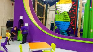 What i did like is how they used the drop slide and a barrier/ gateway into the climbing arena. You have to walk through a little tunnel/doorway under the slide to get to the climbing walls. That’s when the fun began.